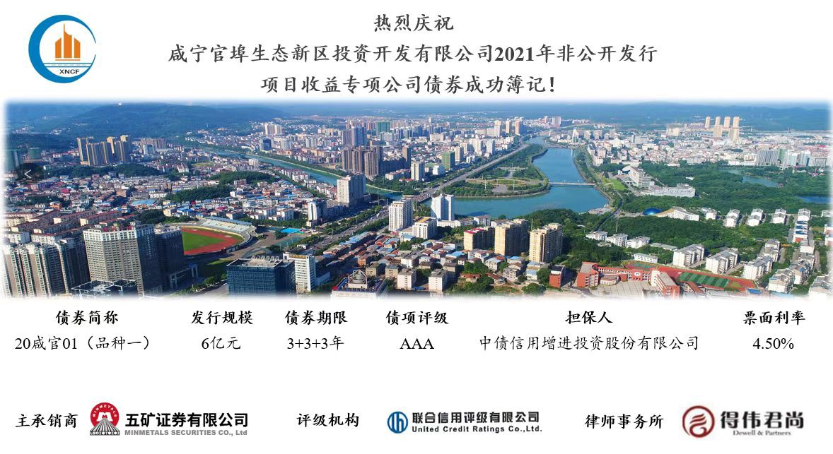 ??????? 2021年3月11日,由中債信用增進(jìn)投資股份有限公司(以下簡(jiǎn)稱(chēng)“中債信用增進(jìn)公司”)提供增信服務(wù)的“咸寧官埠生態(tài)新區(qū)投資開(kāi)發(fā)有限公司2021年非公開(kāi)發(fā)行項(xiàng)目收益專(zhuān)項(xiàng)公司債券(品種一)”成功發(fā)行,金額6億元,期限為9年(3+3+3),票面利率4.5%。