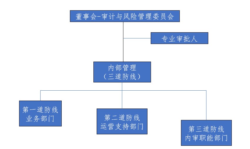 在董事會審計與風(fēng)險管理專業(yè)委員會指導(dǎo)下,公司構(gòu)建了以專業(yè)審批人業(yè)務(wù)審批會為項目審批機構(gòu),三道風(fēng)險防線相互協(xié)調(diào)、相互配合的風(fēng)險管理全流程框架體系。在具體業(yè)務(wù)條線方面,建立了風(fēng)險管理的三道防線:業(yè)務(wù)部門是抵御風(fēng)險的第一道防線,負(fù)責(zé)本部門內(nèi)現(xiàn)存或?qū)⒊霈F(xiàn)的所有風(fēng)險,建立合理的流程有效地識別、評估和控制風(fēng)險;風(fēng)險管理、法律合規(guī)、計劃財務(wù)等運營支持部門是抵御風(fēng)險的第二道防線,負(fù)責(zé)制定相應(yīng)制度,明確相關(guān)部門的防線管理職責(zé)和業(yè)務(wù)流程,識別、評估和平衡所有風(fēng)險;內(nèi)審職能部門是抵御風(fēng)險的第三道防線,對公司內(nèi)部控制體系的完整性和執(zhí)行有效性進行獨立測試和評估,提出改善經(jīng)營管理、加強風(fēng)險防控的建議。三道防線相互協(xié)調(diào)配合,形成了公司的重大風(fēng)險決策、風(fēng)險資產(chǎn)配置、風(fēng)險資產(chǎn)管理的組織支撐。